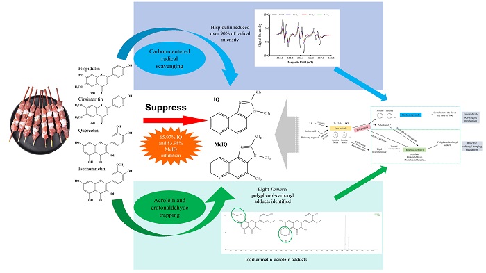 Conclusion:The formation of IQ and MeIQ involves complex chemical pathways, particularly in meat matrix systems, where carbon-centered radicals and reactive carbonyl species (acrolein/crotonaldehyde) jointly contribute to the HAs generation. Effective mitigation strategies should prioritize reducing these precursors during thermal processing. This study established that Tamarix polyphenols suppressed IQ and MeIQ formation through dual mechanisms: scavenging carbon-centered radicals and trapping reactive carbonyls via adduct formation. Eight poly-phenol‑carbonyl adducts were preliminarily characterized, including mono- and di-acrolein conjugates of isorhamnetin and quercetin, mono- acrolein adducts of hispidulin, and mono-crotonaldehyde adducts of isorhamnetin, hispidulin, and quercetin. These findings propose a novel dual-action mechanism: simultaneous radical scavenging and carbonyl trapping disrupt critical precursor pathways, providing new insights for polyphenol-mediated inhibition of heat-induced food hazards.